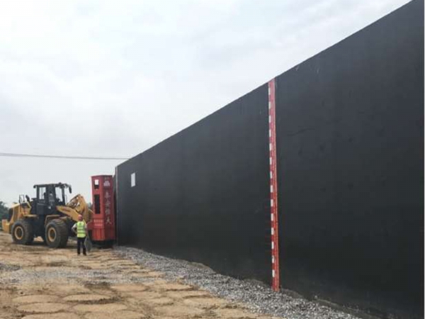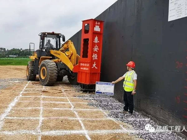 層厚標記采用定制15cm紅白相間的反光貼紙控制層厚,并公示臺背責任卡,使用高速液壓夯實機進行夯實,提高涵背填筑質量。