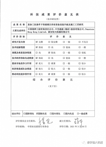2021年3月10日,中國(guó)水運(yùn)建設(shè)行業(yè)協(xié)會(huì)在北京主持召開了由中國(guó)港灣工程有限責(zé)任公司、中交疏浚(集團(tuán))股份有限公司、中交第四航務(wù)工程勘察設(shè)計(jì)院有限公司、Penstone Hong Kong Limited和泰安恒大機(jī)械有限公司共同完成的“復(fù)雜工況條件下快速液壓夯實(shí)設(shè)備改造升級(jí)及施工工藝研究”科技成果評(píng)價(jià)會(huì),評(píng)價(jià)委員會(huì)(名單附后)聽取了項(xiàng)目組的匯報(bào),審閱了研究報(bào)告、科技查新報(bào)告和應(yīng)用證明等材料。